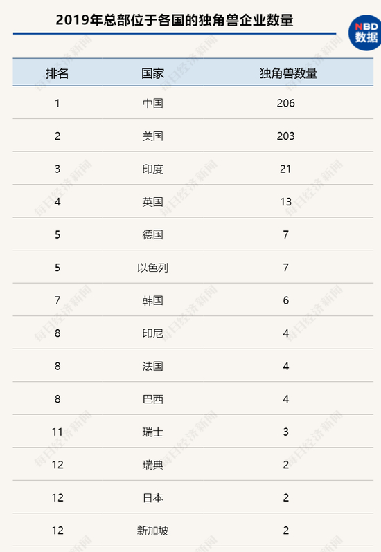 2019年10月发布的2019版全球独角兽企业榜显示,总部位于中国的独角兽企业(估值在10亿美元以上,创办不超过10年,获得过私募投资且未上市)数量超过美国,位居全球第一。