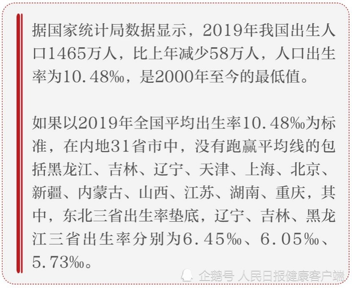 如果以2019年全国平均出生率10.48‰为标准,在内地31省市中,没有跑赢平均线的包括黑龙江、吉林、辽宁、天津、上海、北京、新疆、内蒙古、山西、江苏、湖南、重庆,其中,东北三省出生率垫底,辽宁、吉林、黑龙江三省出生率分别为6.45‰、6.05‰、5.73‰。