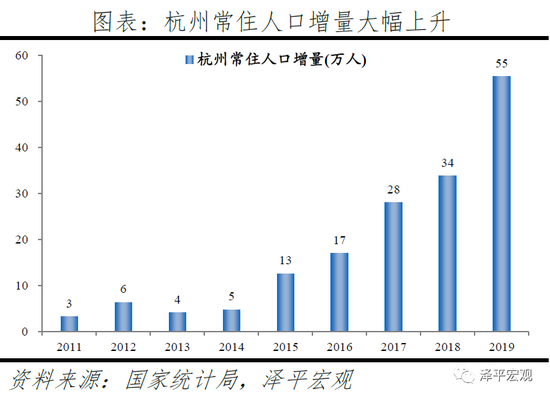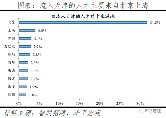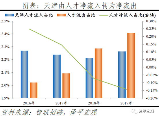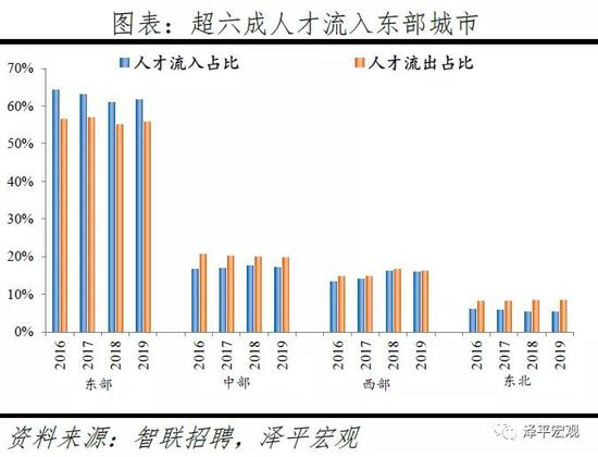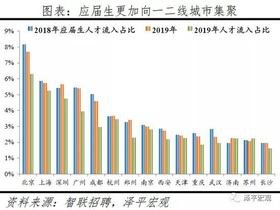 3)深圳:2016-2019年人才净流入占比分别为-0.2%、0.1%、0.4%、0.2%,主因深圳经济发展速度较快、人才政策有吸引力;深圳和广州互为人才外流第一目标城市,深圳流向广州和广州流向深圳的人才流出在全国流动人才总量中占比分别为0.7%、0.6%,规模基本平衡。2015年深圳常住人口增量从2014年的15万大幅上升至60万,2015-2018年平均增量为56万。2016-2019年深圳人才流入占比基本稳定在4.9%左右,分别为4.8%、5.1%、5.0%、4.7%,但人才流出占比呈下降趋势,分别为5.0%、4.9%、4.6%、4.6%。从来源看,人才向深圳流入的前十大城市分别为广州、北京、天津、东莞、上海、成都、长沙、武汉、惠州、佛山,合计占比达52.8%,高于2018年前十来源地的50.4%,深圳的人才来源集中度有所提高。其中,珠三角城市有4个,占比22.9%;流入深圳的人才中13.1%来自广州,流入广州的人才中17.4%来自深圳,深圳和广州互为人才来源城市的第1位。人才流入深圳主要因为经济发展速度相对较快和人才政策有吸引力。2019年深圳GDP增速6.7%,高于全国平均的6.1%,也高于北京和上海的6.1%、6.0%;2016-2019年深圳平均GDP增速为8.0%,高于广州、北京、上海的7.0%、6.6%、6.6%。深圳还拥有华为、腾讯、平安等众多著名企业,尤其是互联网企业,吸引大量人才。深圳的落户政策逐渐放宽,且补贴幅度较大,根据深圳市人力资源和社会保障局数据,2016年深圳将全日制本科生、硕士、博士的租房相关补贴从6000、9000、12000元分别提高至15000、25000、30000元,2017年落户门槛放宽至35岁以下专科学历人才,对新引进的两院院士和杰出人才、地方级领军人才、后备级人才分别给予300万、200万、160万的奖励。从去向看,深圳人才外流的前十大城市分别为广州、东莞、上海、北京、惠州、佛山、长沙、杭州、武汉、成都,合计占比达53.9%,低于2018年前十去向地的56.4%,深圳人才流向的方向更加分散。其中,广州占比达15.0%,珠三角城市有4所,合计占比32.3%,深圳和珠三角地区人才流动频繁;流出深圳的人才中15.0%流向广州,流出广州的人才中18.6%流向深圳,深圳和广州互为人才外流目标城市的第1位,深圳流向广州和广州流向深圳的人才流出在全国流动人才总量中占比分别为0.7%、0.6%,规模基本平衡。