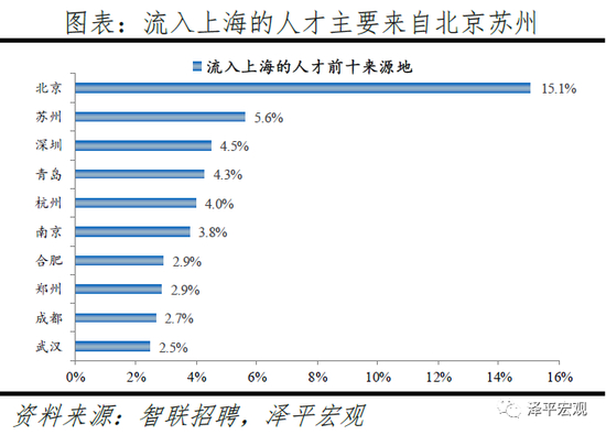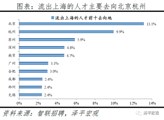 2)上海:2016-2019年人才净流入占比分别为1.3%、1.2%、0.9%、0.5%,持续净流入但逐渐下降,主因上海控制人口及产业转移。2011-2019年上海常住人口增长明显放缓,增量从44万降至4万,其中有两年为负。2016-2019年上海人才流入占比分别为6.3%、6.1%、5.6%、5.2%,持续下降,人才流出占比分别为4.9%、4.9%、4.7%、4.8%,流入大于流出,人才净流入占比分别为1.3%、1.2%、0.9%、0.5%。从来源看,人才向上海流入的前十大城市分别为北京、苏州、深圳、青岛、杭州、南京、合肥、郑州、成都、武汉,合计占比达48.1%,显著高于2018年前十来源地的45.7%,上海人才来源集中度有所提高。其中,北京占比15.1%,而长三角城市有4个、合计占比16.3%。人才流入上海主要因为上海的经济体量大、薪酬水平高。2019年上海GDP规模达到3.8万亿、位列全国城市第一。2019年上海流入人才中9.9%流向商业服务,显著高于其余9个重点城市。13个行业中上海有4个薪酬位列第一、8个位列第二,其中商业服务位列第一。从去向看,上海人才外流的前十大城市分别为北京、杭州、苏州、深圳、南京、广州、合肥、成都、郑州、无锡,合计占比达51.6%。其中,长三角城市有5个,合计占比达25.9%,长三角城市对上海的人才有分流作用。人才流出上海主要因为上海控制人口规模和产业转移,2016年上海“十三五规划”及《上海城市总体规划纲要(2015-2040)》均要求2020年及之后上海常住人口控制在2500万人以内。根据国家统计局数据,2013-2018年上海规模以上工业企业减少1666家。2019年上海流出人才的7.6%、7.4%来源于服务业和金融业,高于其余9个重点城市,也高于上海流入人才流向该行业的比例4.4%、5.7%。