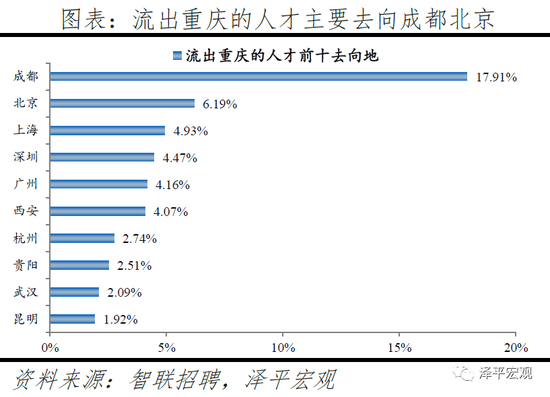 3)重庆:2016-2019年人才净流入占比分别为-0.1%、-0.1%、0.5%、0.3%,2018年由负转正主因对信息技术产业具有较强的人才吸引力。重庆常住人口增量维持在高位,2011-2019年增量平均为27万。2016-2019年重庆人才流入占比总体呈上升趋势,分别为1.3%、1.3%、2.0%、1.8%,人才流出占比在2016-2018年均为1.4%、2019年上升至1.6%,导致人才净流入占比分别为-0.1%、-0.1%、0.5%、0.3%,逐年上升且2018年由负转正。从来源看,人才向重庆流入的前十大城市分别为成都、北京、西安、长沙、上海、深圳、天津、贵阳、广州、武汉,合计占比达62.8%。其中,成都流入重庆占比达26.4%,高于大部分城市第一来源地占比,主要因为地理位置近且电子产业等具有较强吸引力。2019年重庆流入人才中25.7%流向IT|通信|电子|互联网行业,高于除杭州外的其余8个重点城市,也明显高于流出人才从事该行业的比例13.1%,其中2019年重庆流入人才中14.4%流向互联网/电子商务的二级行业中,显著高于其余9个重点城市。根据国家统计局和中国电子信息产业统计年鉴数据,重庆电子商务企业个数2013-2018年从640个增加到2545个;重庆规模以上电子信息企业个数2008-2017年从68个增加到540个。重庆市统计局数据显示,2019年1-11月重庆规上软件和信息技术服务业营收同比增长45.2%,高于全国2019年信息技术服务业营收增速的20.8%。从去向看,重庆人才外流的前十大城市分别为成都、北京、上海、深圳、广州、西安、杭州、贵阳、武汉、昆明,合计占比达51.0%。
