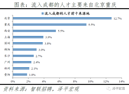 4)武汉:2016-2019年人才净流入占比分别为-0.3%、0.0%、0.8%、0.1%,2017年由负转正,主因“百万大学生留汉”政策实施。2011-2019年武汉常住人口增量平均为16万人,常住人口保持较高增长。2016-2019年武汉人才流入占比分别为2.1%、2.2%、2.7%、1.9%,人才流出占比2.3%、2.1%、1.9%、1.8%,逐年下降,使得人才净流入占比分别为-0.3%、0.0%、0.8%、0.1%。主要因为2017年开始的“百万大学生留汉创业就业工程”,大学生可以低于市场价20%买到安居房或租到租赁房;不满40周岁的留汉大学毕业生可凭毕业证落户,硕士、博士不受年龄限制可直接落户;专科、本科、硕士、博士的指导性最低年薪标准分别为4万元、5万元、6万元、8万元。根据武汉市委组织部,2017-2019年新增留汉大学生共109.5万人,提前两年完成2017年确定的五年达到100万的目标。从来源看,人才向武汉流入的前十大城市分别为北京、深圳、上海、郑州、长沙、成都、广州、西安、杭州、襄阳,合计占比达45.0%。从去向看,武汉人才外流的前十大城市分别为北京、深圳、上海、广州、杭州、长沙、南京、成都、郑州、宜昌,合计占比达45.1%。