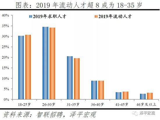4)从工作年限看,流动人才中46%工作5年及以下,高于求职总体的44%,职场新人更有可能跨城求职。2019年求职人才中工作年限为1年及以下、1-3年、3-5年、5-10年、10-20年、20年以上分别占3.1%、21.1%、19.4%、30.3%、22.3%、3.8%,流动人才中各工作年限人才分别占比3.3%、23.0%、19.3%、28.2%、21.9%、4.3%,其中工作5年以下的分别占比43.6%、45.7%,说明部分职场新人的职业发展和生活愿景尚有较大不确定性、更有可能跨城求职。而在2018年上述比例分别为39.3%、40.4%,2019年流动人才更加集中于5年及以下。
