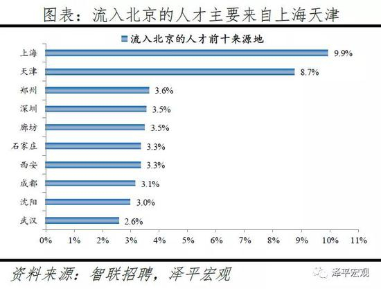 1)北京:2016-2019年人才净流入占比分别为-0.7%、-2.3%、-2.7%、-3.9%,持续为负且降幅扩大,主因北京严控人口、疏解产业;北京和上海互为人才外流第一目标城市,北京流向上海、上海流向北京的人才流出在全国流动人才总量中占比分别为0.8%、0.6%,人才从北京净流向上海。北京常住人口增量逐年下滑,2011-2018年从57万降至-17万,2019年缩窄至-1万,2017-2019年连续3年为负,2016-2019年北京的常住人口增量始终在一线城市中最低。2016-2019年北京人才流入占比分别为7.2%、7.3%、7.1%、6.3%,但人才流出占比持续攀升,分别达7.9%、9.6%、9.9%、10.2%,北京的人才流入和人才流出均居全国城市首位,但流出逐年攀升、流出明显大于流入,使得人才净流入占比分别为-0.7%、-2.3%、-2.7%、-3.9%。从来源看,2019年人才向北京流入的前十大城市分别为上海、天津、郑州、深圳、廊坊、石家庄、西安、成都、沈阳、武汉,合计占比达44.7%。其中,京津冀城市有3个,合计占比达15.6%。人才流入北京主要因为北京经济体量大、薪酬水平高,2019年GDP规模达到3.5万亿,仅次于上海、排名第二,同时13个行业中北京有8个的薪酬位于所有城市之首。从去向看,北京人才外流的前十大城市分别为上海、天津、深圳、成都、廊坊、济南、杭州、广州、石家庄、西安,合计占比达42.5%。其中,流出北京的人才中7.7%流向上海,流出上海的人才中13.1%流向北京,北京和上海互为人才外流目标城市的第1位,北京流向上海和上海流向北京的人才流出在全国流动人才总量中占比分别为0.8%、0.6%,人才从北京净流向上海。流出北京的人才增多主要因为北京控制人口、疏解产业。2013年北京开始严控人口,2015年发布的《京津冀协同发展规划纲要》要求北京外迁非首都核心功能,2020年及之后北京常住人口控制在2300万人以内。根据北京市发改委,截至2019年底,北京市不予办理的工商登记业务累计达2.28万件;2014-2019年北京市退出一般制造业企业2759家,疏解提升市场631个、物流中心122个。根据国家统计局数据,2014-2018年北京规模以上工业企业单位数累计减少489家。2019年北京流出人才的29.7%来源于IT|通信|电子|互联网行业,高于除深圳外的其他8个重点城市,也高于北京流入人才流向该行业的比例23.4%。