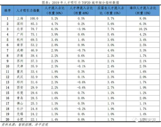 从人才吸引力指数观察,2019年上海、深圳、北京位居前三名,上海连续三年第一,广州、杭州、南京、成都、济南、苏州、天津位居前十。为衡量城市的人才吸引力,定义人才吸引力指数为人才流入占比、人才净流入占比、应届生人才流入占比、海归人才流入占比的加权结果。人才流入占比=流入某城市的人才/全国流动人才总量,人才净流入占比=(流入某城市的人才-流出某城市的人才)/全国流动人才总量,分别反映该城市引得来和留得住的能力。其中,流入某城市的人才指现居住地不在该城市、但简历投向了该城市的人才;流出某城市的人才指现居住地为该城市、但简历投向了其他城市的人才;全国流动人才总量指现居住地和简历投向地不一致的人才。应届生人才流入占比=流入某城市的应届生流动人才/应届生流动人才总量,海归人才流入占比=流入某城市的海归流动人才/海归流动人才总量,分别反映城市对年轻高学历人才和海归高学历人才的吸引力。从结果看,经济体量大且增长稳定的上海市人才吸引力指数2017年由第二名升至第一名,随后三年持续第一;由于深圳经济发展速度较快且人才政策吸引力强,2016-2019年深圳排名第3、3、3、2位;北京因严控人口、疏解产业,排名为第1、2、2、3位,有所下降;广州则始终为第4位;杭州因电商为代表的产业发展迅速,连续四年稳居第5;南京为第6、6、7、6名;成都2019年为第7名且近三年较为稳定;济南2019年为第8名,比2018年的第14名有所上升;苏州为第7、8、9、9,较为稳定;天津为第8、10、12、10名。2019年前50强中,东部、中部、西部、东北地区分别有33、6、8、3个;一二三四线分别有4、32、14、0个,分别占一二三四线城市数量的100%、91%、17%、0%;长三角、珠三角、京津冀、成渝、长江中游城市群分别有12、7、5、2、3个。