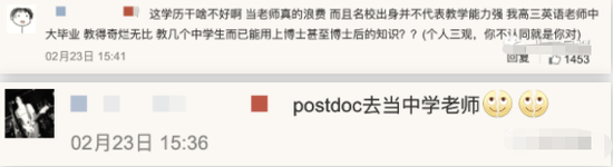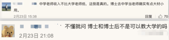 还有网友表示,博士去中学当老师确实有点大材小用,不是可以教大学的吗?
