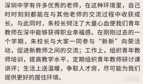 在知乎问答“在深圳中学就读是怎样一番体验”这一话题中,有答主也提到,“很多很厉害的老师。我上过课的(不一定是我们班)老师,有清华、北大、复旦之类的名校毕业硕士、博士。”