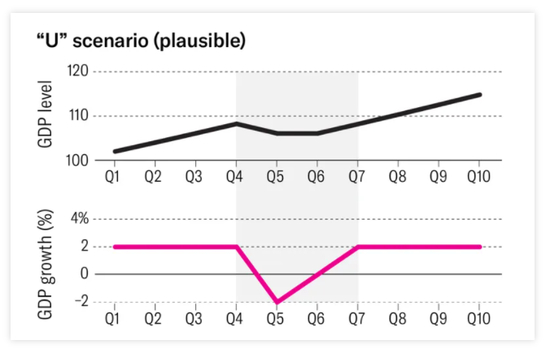 由此,经济学家给出的第二个预测模型是“U型”复苏。若增长连续两个季度下滑,那么在反弹之前,可能会持续4—8个季度,在此期间会出现一段时间的高失业率和低通胀期。