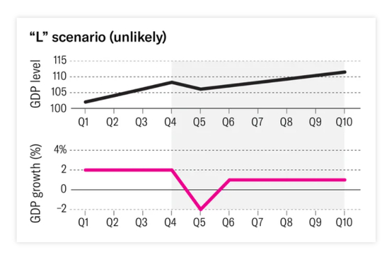 而最后一种“L”型复苏更令人绝望,它指的是经济增速急速下降后几乎没有复苏。个人和企业受到不可逆的伤害:失业率居高不下,破产现象持续出现,也就是所谓的“经济大萧条”。