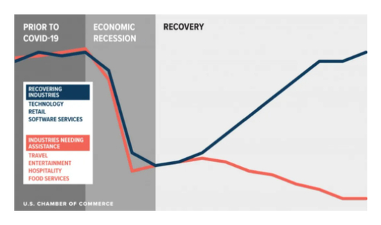 K型复苏本质上是分化,是一种差异化复苏。在经济遭遇整体性下跌后,一部分产业和经济体反弹上升,另一部分仍然维持在低位,形成分叉走势,很像英文字母“K”。