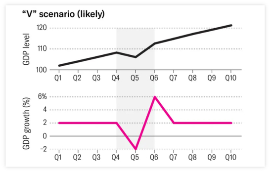 第一种是经济触底后,立即反弹的“V型”复苏。若经济增长连续两个季度下滑,紧接着的两个季度出现反弹,对于任何一个从衰退中复苏的经济体而言,这都是最理想的复苏模型。