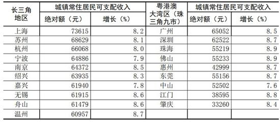 广东省统计局分析指出,总体来看,大湾区珠三角九市除广州、深圳居民生活水平可以与长三角地区城市相媲美之外,其余城市难以跟长三角地区的主要城市相比,居民收入总体水平明显低于长三角地区,收入差距也高于长三角地区。