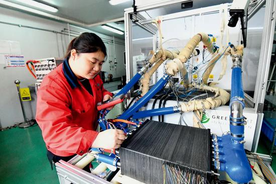 2017年11月10日,江苏南通百应能源有限公司的检测员正在对氢燃料电池进行电堆性能测试。图/新华