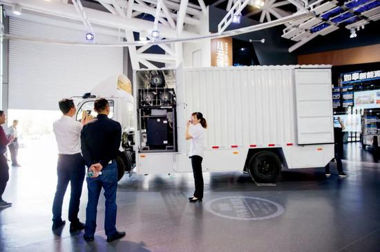 2019年5月22日,参观者在江苏如皋氢能小镇参观汽车文化馆里的氢燃料物流车。图/IC