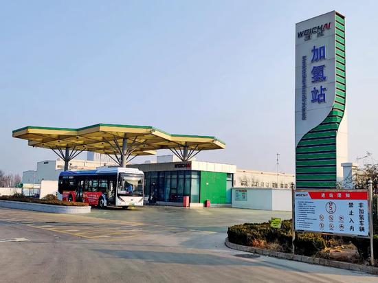在山东潍坊市潍柴加氢站内加氢的公交车。图/潍柴动力