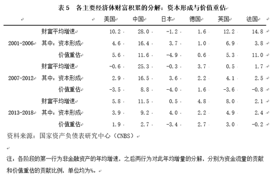 第二,价值重估对财富增长的贡献率逐渐下降。价值重估可以解释中国财富的增长,但它并不是中国财富增长与发达经济体差异的主因;中国以远远高于发达经济体的资本形成(主要源于高储蓄的支撑),才导致了财富的更快积累(见表5)。而且,在财富增长的贡献中,中国的价值重估效应相对于资本形成效应也处于不断下降的态势。