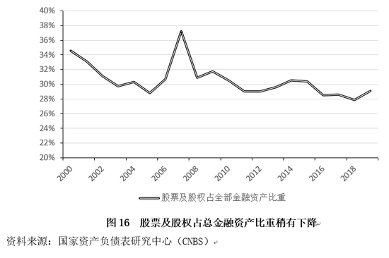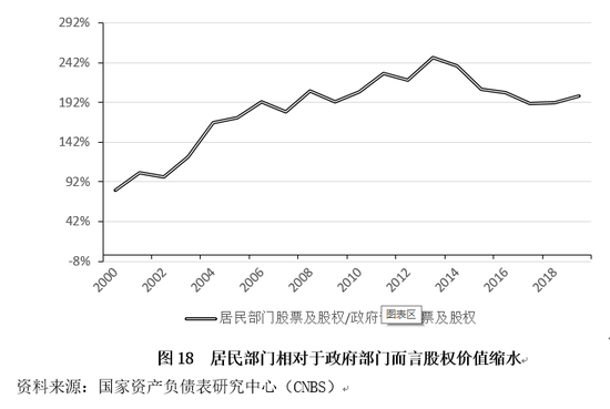 其次,居民部门所持有的股票及股权比例在2013年之后有所下降。为应对2008年的国际金融危机,中国出台了大规模的刺激计划,政府驱动经济的特征愈加显著:一方面是地方政府债务迅速扩张,另一方面国有经济规模也在壮大。图18显示,2013年之后,政府持有的净财富占比和政府持有的股票及股权占比都有所上升。这使得居民部门持有的股票及股权资产占比出现下降,股权价值上升带来的财富积累效应向政府部门而非居民部门倾斜。