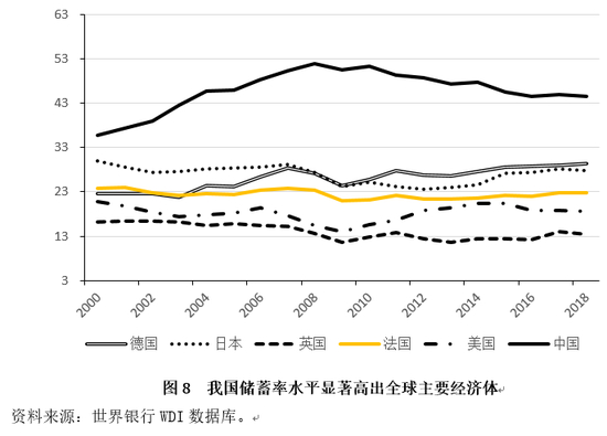 首先,中国具有相对更高的储蓄率。中国的总储蓄率(Gross saving)长期保持在40-50%之间,2018年达44.6%;而美国的总储蓄率不及中国的一半,2018年仅为18.6%。其余各主要经济体储蓄率大体处于30%以下水平(见图8)。储蓄率决定了中国与其他主要经济体之间资本积累速度不同。近20年来,中国的资本形成率年平均为40%左右,也就是说,总产出中有将近四成比例通过投资形成了财富积累,而发达经济体的产出则大多用于消费,新增资本积累的比例较小。