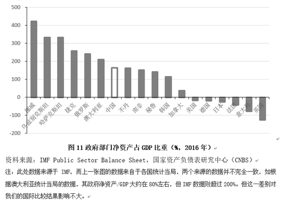 需要指出的是,图11与图10呈现的国际比较有所差异。特别是日本与德国政府净资产在图9中为正,在图10中为负。这是由于各国统计当局标准不同而IMF“强行”使其一致的结果。主要差别就在于养老金。日、德两国统计当局所公布的政府资产负债表中都没有养老金负债,而IMF给加上了,导致两国政府净资产下降较多,由正转负。