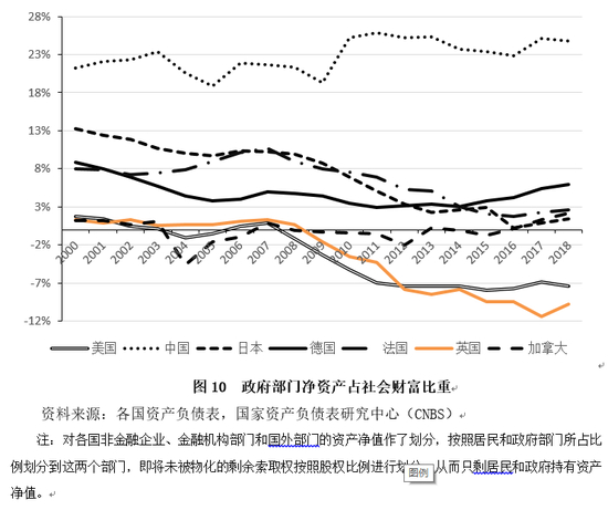 第二,中国政府净资产占比远远高于几个主要发达经济体。英、美政府净资产是负值,日本、法国和加拿大政府持有净资产占比在0-5%之间;德国政府持有资产的比例略高,2018年为6%。而中国政府的净财富占比大体上超过20%。