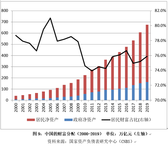 2019年,我国675.5万亿的社会净财富中,居民部门财富为512.6万亿,占比76%;政府部门财富为162.8万亿,占比24%。从时间序列来看,居民财富占比呈现波动,2000-2005年呈上升态势,2005-2011年呈下降态势,2011-2019又呈上升态势。2000-2009年居民财富平均占比为78.4%,而2010-2019年平均占比下降为75.2%。因此,从新世纪的前10年与后10年比较来看,居民财富占比下降了2.8个百分点。