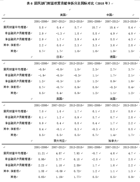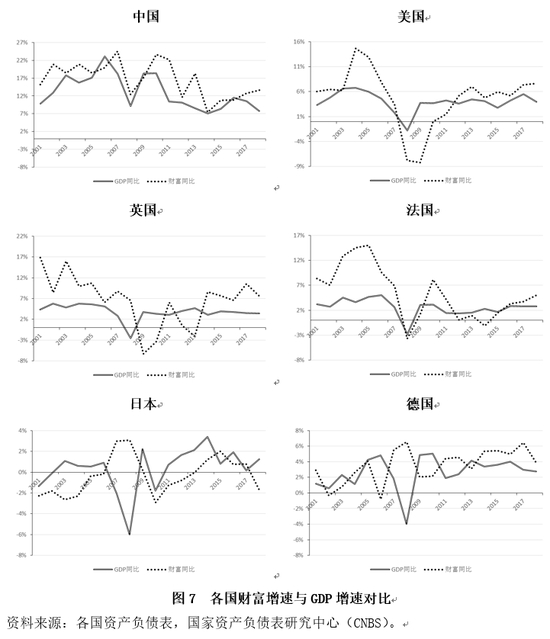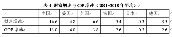 图7展示了各主要经济体财富增速与名义GDP增速的对比。有两点发现:其一,从基本趋势上看,财富增长的波动与GDP相似,体现出存流量的一致性,也从侧面反映出基于国家资产负债表的财富估算是比较可靠的。其二,总体而言,财富增速高于GDP增速,而中国尤为明显。表4作了一下对比,除日本外,其它国家财富增速均高于名义GDP增速。