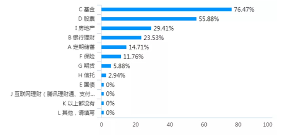 金融圈女性在理财投资上则具有优势,她们理财的手段也较为多样。在受访的金融圈女性中,基金、股票是她们主要的理财投资方式,同时房地产、银行理财的比例也超过了20%(图28)。