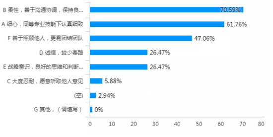 在新财富的调查中,“柔性、善于沟通,保持良好的人际关系”、“细心、同等专业技能下认真细致”、“善于照顾他人、更易团结团队”是女性在金融行业职位晋升上的最大优势,同时,“诚信、较少套路”、“战略意识,良好的思维和判断能力”也有26.47%的选择比例(图22)。