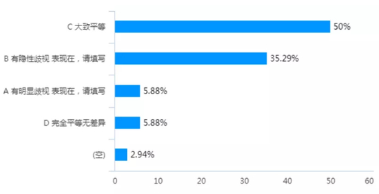 同时,在“金融行业的晋升环境性别平等与否”这一问题上,有一半的金融圈女性选择“大致平等”,选择有隐性歧视的比例也达35.29%,主要表现为“女性高管比例低”。另外,选择“有明显歧视”的比例也近6%,主要表现在“在同等条件下优先录取男性”(图20)。