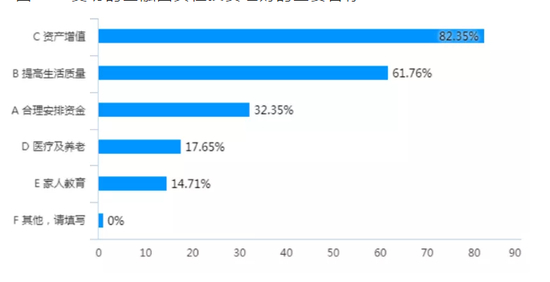 相对应的,资产增值也是她们的主要理财目标,提高生活质量和合理安排资金的选择比例分别达到61.76%和32.35%(图30)。
