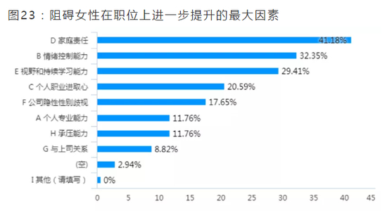 然而“家庭责任”、“情绪控制能力”、“视野和持续学习能力”则是阻碍女性在职位上进一步提升的最大因素,其中家庭责任排在第一位,达到41%的选择比例(图23)。