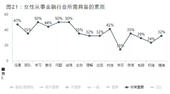 对于从事金融行业的女性来说,为了提升晋升机会,除社会进步等因素外,个人可以做哪些努力呢?在新财富的调查中,对于金融圈的女性来说,学习能力、问题解决能力和诚信是最需具备的素质,而对于普遍为高学历的金融圈来说,“学历”以及“和谐”则相对来说没那么重要(图21)。