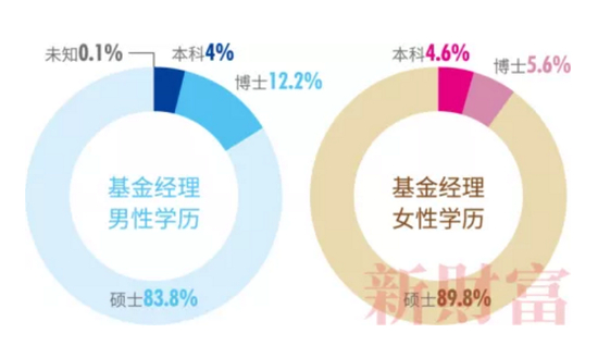 95%以上的基金经理拥有硕士及以上学历,在高学历的博士中,女性基金经理的比例低于男性,但硕士学位的比例达到89.8%(图5)。