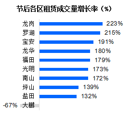 但值得一提的是,根据贝壳找房成交数据显示,龙岗区的成交涨幅也是各区中最高的,相比春节前增长223%,其次是罗湖,环比增长215%,这两个区也是各区租金中涨幅最大的。