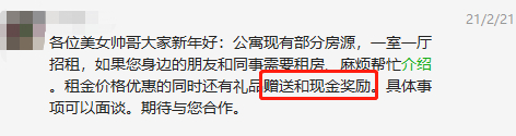 在科技园上班的C先生,住在南山某公寓,年初的时候二房东就信誓旦旦表示“不会涨租,放心住”,过了元宵节,甚至在群里发出了“悬赏通知”,有一部分空闲房源,帮忙介绍还有礼品赠送和现金奖励。