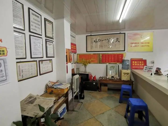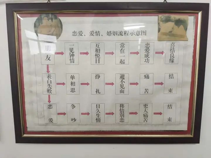 军绿色的镂空铁门锈迹斑斑,精心装裱的婚姻指南和受访照片挂满墙面,虽然早已字迹泛黄、布满灰尘。