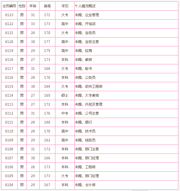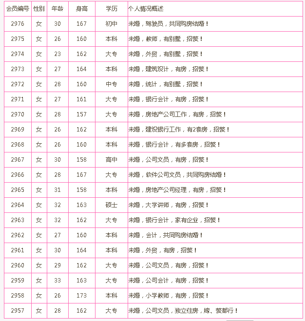 目前,该婚介所在官网上发布有132位招婿女会员与43位入赘男会员的相关信息。综合这些个人信息与李继延的讲述,萧山赘婿来自全国,如湖南、湖北、河北、安徽、江西、江苏、云南等,他们的年龄普遍集中于25岁到30岁,职业大多是各类工程师、技术员、经理,也不乏大学教师、公务员、企业管理层及创业者。从学历来看,基本是大专以上,其中,本科生最多,占比达到三分之二,同时,不乏研究生。