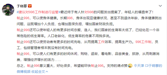 “制止996,可以使身体健康。长期996,身体出现亚健康状况,甚至不到退休年龄,身体健康就出问题,这既增加个人负担,也增加医保负担,增加国家财政负担。
