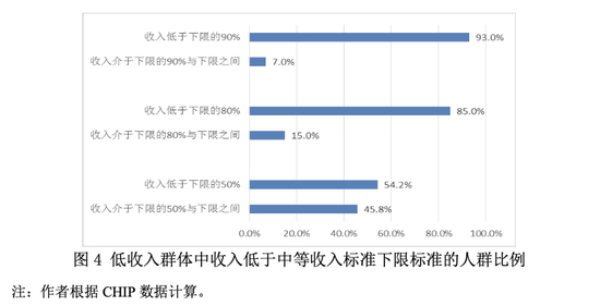 根据2018年CHIP数据测算,在低收入人群中有15%的人群其收入水平与中等收入群体(下限)标准的差距不足20%(见图4),即他们的收入虽低于下限但高于下限的80%。他们应该是在未来5-10年最有希望进入到中等收入行列、也是最有潜力成为中等收入人群的群体。如果这部分人群成为中等收入群体后,那么我国中等收入人群比重会上升约10个百分点,中等收入人群规模会超过5亿人。另外,如图4所示,低收入人群中有46%人群其收入水平高于中等收入(下限)标准的50%,他们应该是在未来15-20年中我国中等收入的潜力人群。