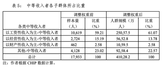 从按收入来源来看,我国中等收入群体中绝大多数为工薪阶层家庭人口。如表5所示,近60%的中等收入群体以工资性收入为主(工资性收入比重>=50%),14%左右的中等收入群体以经营性收入为主(经营性收入比重>=50%),仅有2.6%以财产性收入为主(财产性收入比重>=50%)。