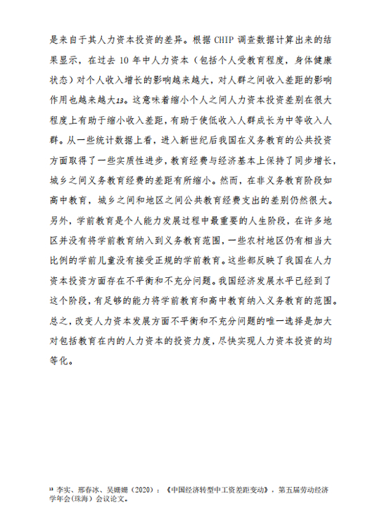 从一些统计数据上看,进入新世纪后我国在义务教育的公共投资方面取得了一些实质性进步,教育经费与经济基本上保持了同步增长,城乡之间义务教育经费的差距有所缩小。然而,在非义务教育阶段如高中教育,城乡之间和地区之间公共教育经费支出的差别仍然很大。另外,学前教育是个人能力发展过程中最重要的人生阶段,在许多地区并没有将学前教育纳入到义务教育范围,一些农村地区仍有相当大比例的学前儿童没有接受正规的学前教育。这些都反映了我国在人力资本投资方面存在不平衡和不充分问题。我国经济发展水平已经到了这个阶段,有足够的能力将学前教育和高中教育纳入义务教育的范围。总之,改变人力资本发展方面不平衡和不充分问题的唯一选择是加大对包括教育在内的人力资本的投资力度,尽快实现人力资本投资的均等化。
