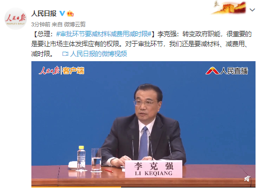 【总理:#审批环节要减材料减费用减时限#】李克强:转变政府职能,很重要的是要让市场主体发挥应有的权限。对于审批环节,我们还是要减材料、减费用、减时限。