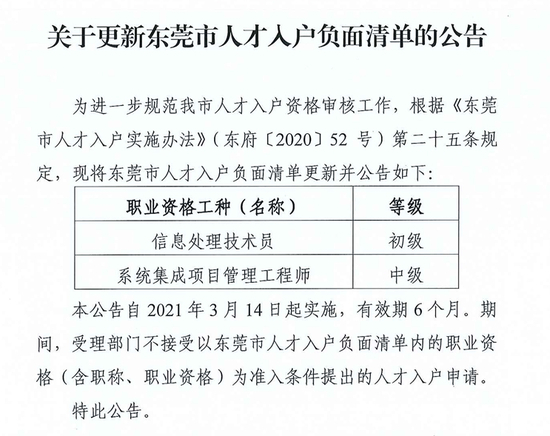 (1)2021年3月14日起,6个月内,东莞市人社局不受理以信息处理技术员(初级)和系统集成项目工程师(中级)为准入条件的人才入户申请。