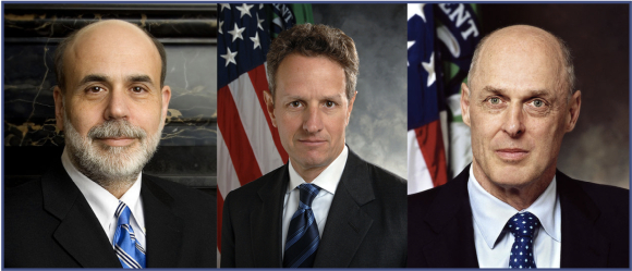 “救市三人组”:时任美联储主席伯南克(左)、纽约联邦储备银行行长盖特纳(中)、财政部长保尔森(右)