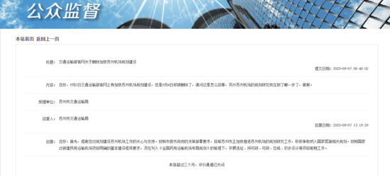 在苏州市姑苏区人民政府官网公众监督栏目下,有人就此询问:“9月2日交通运输部官网上有加快苏州机场规划建设,但是9月4日却被删除了,请问是怎么回事?”名为“苏州市交通运输局”的回复人回应称,“目前苏州市正加快推进苏州机场的规划研究工作,积极争取纳入国家层面相关规划”。
