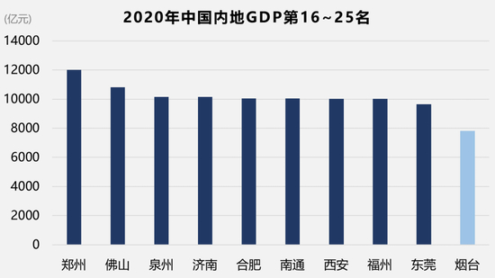 而东莞之后,经济总量第25名是烟台,去年GDP“只有”7816.4亿元,和东莞之间隔着近2000亿元的鸿沟,短时间内难以跨越。