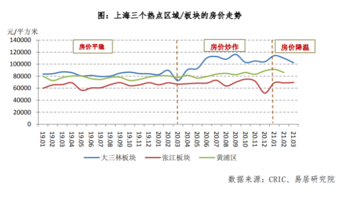 易居研究院对上海浦东大三林板块、张江板块和黄浦区三个学区相对热的区域/板块进行分析发现,这三个区域/板块的价格在2019年较为稳定,而到了2020年尤其是二季度开始,浦东三林板块、张江板块开始出现价格明显上涨,同时市场开始出现一房难求、哄抬房价、预期不稳等乱象。