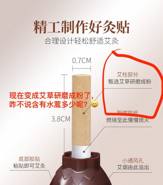 除此之外,“蕲大妈”旗舰店里搭配艾灸蒲团使用的艾柱也有猫腻。宣传中,该艾柱是采用八百里伏牛山野生艾草、十年陈艾叶、50:1高比例黄金艾绒制作而成。但王海指出,“蕲大妈”所宣称的十年陈艾,不仅年份没有十年,而且是以当年水蒿和部份艾粉参杂而成,所谓50:1高比例纯粹是欺骗消费者。