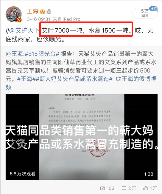 天猫“蕲大妈”被王海打假 被指拿水蒿当艾叶