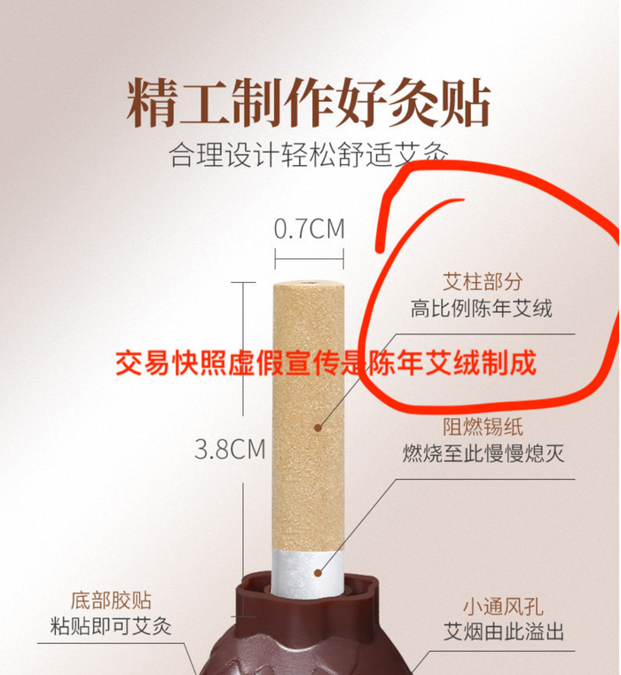 “蕲大妈”旗舰店里搭配艾灸蒲团使用的艾柱也有猫腻。宣传中,该艾柱是采用八百里伏牛山野生艾草、十年陈艾叶、50:1高比例黄金艾绒制作而成。但王海指出,“蕲大妈”所宣称的十年陈艾,不仅年份没有十年,而且是以当年水蒿和部份艾粉参杂而成,所谓50:1高比例纯粹是欺骗消费者。